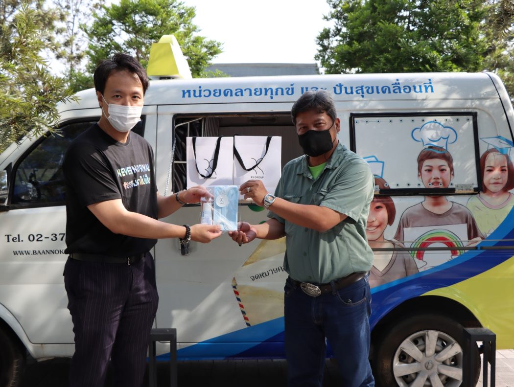 After “The Secret of Happy Life” to fill the joy and smile to communities in Chatuchak District around the headquarters of RS Group at the end of last year, RS intends to continue improving the quality of life for children, community members, and impoverished people. Mr. Wittawat Wetchabutsakorn, CFO of RS Group, and Mr. Mr.Surachai Sukkieo-on or commonly known as Khru Ord, the Director of Baannokkamin Foundation, along with volunteers, artists, celebrities, and COOLJ (DJ of COOLfahrenheit radio), donated 700 sets of hand sanitizer gel and face masks to residents of communities in Chatuchak District and homeless people in Bangkok via the charity vehicle of the Foundation. In this activity, the charity team also educated passersby on how to take care of themselves during the outbreak.