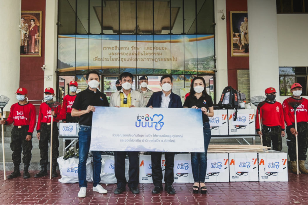 News reporters and supporting team went to the areas to help affected people by offering necessary supplies such as leaf blowers, PM2.5 masks, rakes and other useful items to Chiang Mai province while talking, asking and giving moral support to those affected by the forest fire.