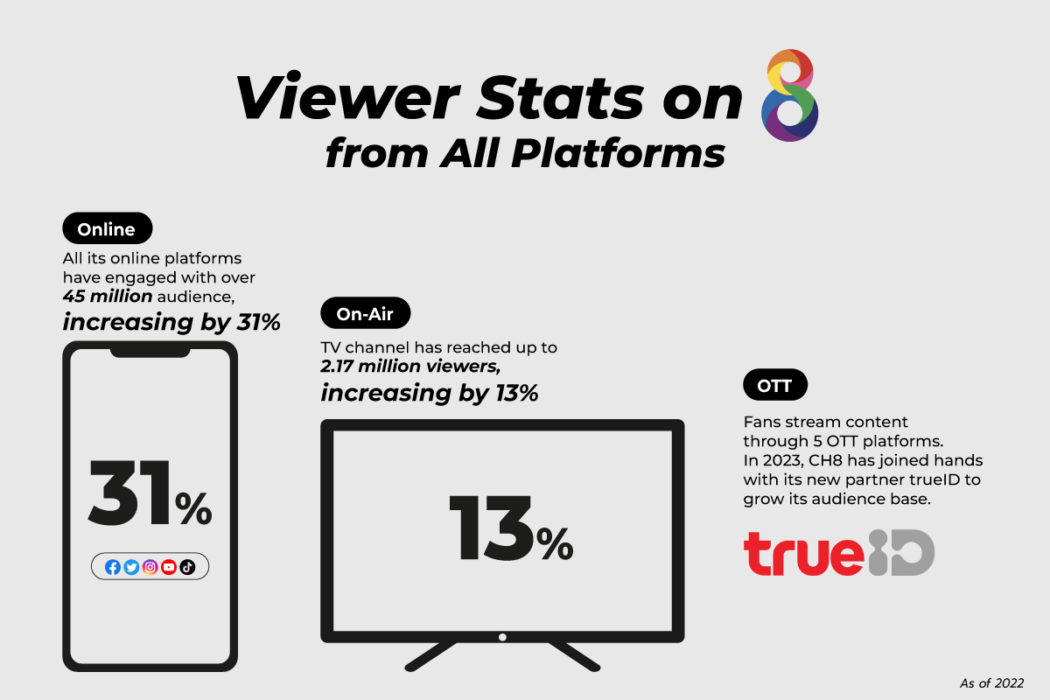 Ms. Nongluk Ngamroj, Head of Channel 8, revealed: “In 2023, Channel 8 will continue expanding our viewer base on all platforms, including on air, online and on ground, with the strategy ‘Channel 8: Have a Blast on All Screens.’ Over the previous year, Channel 8’s online platforms generated a total of 45 million viewers, increasing by 31%. At the same time, the TV channel could reach 2.17 million audience or increased by 13%.