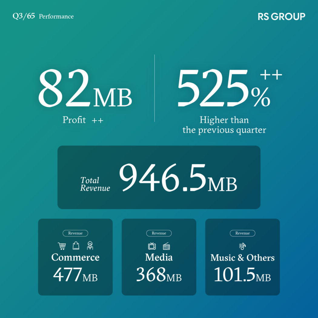 ด้าน คุณวิทวัส เวชชบุษกร ประธานเจ้าหน้าที่สายงานการเงิน บริษัท อาร์เอส จำกัด (มหาชน) กล่าวว่า “สำหรับไตรมาส 3 ของปี 2565 บริษัทฯ มีรายได้รวม จำนวน 946.5 ล้านบาท เพิ่มขึ้น 14.3% จากไตรมาสก่อนหน้า ทำกำไรเติบโตสูงถึง 82 ล้านบาท หรือคิดเป็นเติบโต 525% จากไตรมาสก่อน เป็นผลมาจากทุกธุรกิจหลักที่ฟื้นตัวชัดเจน ทั้งธุรกิจคอมเมิร์ซที่สร้างรายได้ 477 ล้านบาทเติบโตสูง 19.6% จากไตรมาสก่อน และธุรกิจมีเดียและเอ็นเตอร์เทนเมนต์สร้างรายได้ 368 ล้านบาท ซึ่งเติบโต 6.1% จากไตรมาสก่อน โดยการเติบโตของธุรกิจมีเดียและเอ็นเตอร์เทนเมนต์เป็นผลจากรายได้การขายคอนเทนต์ไปยังออนไลน์แพลตฟอร์มที่สูงขึ้น ทั้งนี้ ธุรกิจสื่อที่มีความหลากหลายของบริษัทฯ ทั้งทีวี วิทยุ และช่องทางออนไลน์ ยังถือเป็นส่วนสำคัญของโมเดลธุรกิจ Entertainmerce ซึ่งช่วยเสริมความแข็งแรงของช่องทางการจัดจำหน่ายและเป็นจุดแข็งที่สร้างความแตกต่างให้บริษัทฯ อีกทั้งช่วยสร้างการเติบโตในธุรกิจคอมเมิร์ซด้วย ส่วนธุรกิจเพลงและอื่นๆ มีรายได้จำนวน 101.5 ล้านบาท เพิ่มขึ้น 23.8% จากไตรมาสก่อน และ 134% จากไตรมาสเดียวกันของปีก่อน โดยเติบโตจากการกลับมาของการจัดกิจกรรมต่างๆ หารายได้จากสปอนเซอร์ หลังจากภาครัฐผ่อนคลายนโยบายการควบคุมการแพร่ระบาดของโควิด-19 และจากรายได้การบริหารและจัดเก็บลิขสิทธิ์จากทั้งการใช้ผลงานเพื่อเผยแพร่ในสื่ออื่นๆ และใช้ในสถานบันเทิงที่เริ่มกลับมาดำเนินกิจการเป็นปกติในไตรมาสนี้”