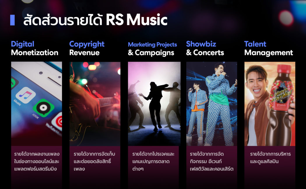 1. Digital Monetization เป็นรายได้จากผลงานเพลงทั้งจากศิลปินรุ่นใหม่และศิลปินระดับตำนานของอาร์เอส จากช่องทางออนไลน์ต่างๆ ไม่ว่าจะเป็นโซเชียลมีเดียอย่าง YouTube, Facebook, Instagram, TikTok หรือแพลตฟอร์มสตรีมมิง ได้แก่ Spotify, Apple Music, JOOX และอื่นๆ
