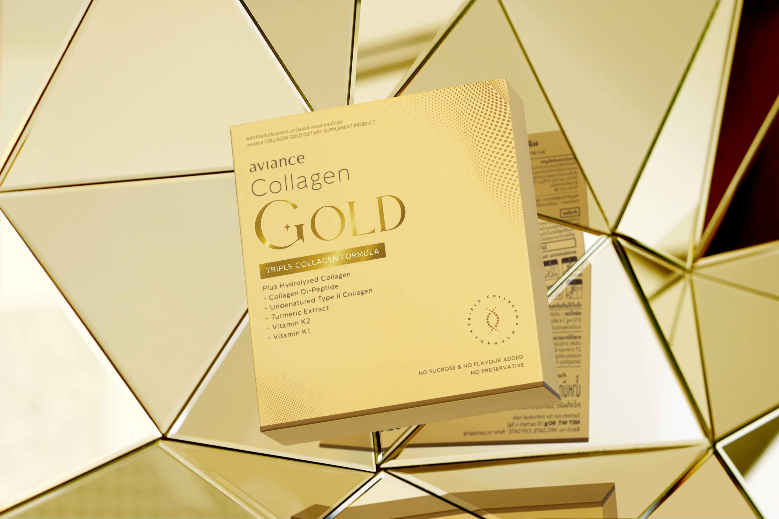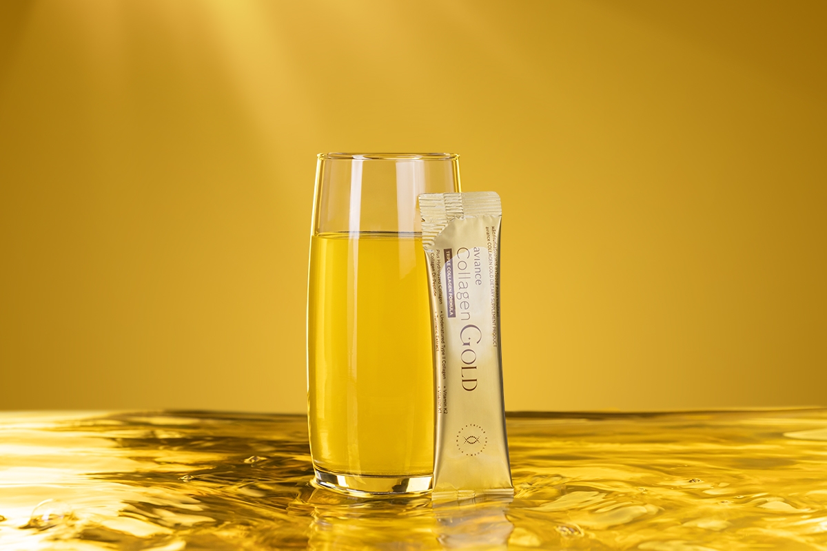 อาวียองซ์ คอลลาเจนโกลด์ มาพร้อมกับสีเหลืองทองโดดเด่น ซึ่งเป็นสีจากธรรมชาติของสารสกัดเทอร์เมอริคที่เป็นส่วนผสมไฮไลต์ ปราศจากน้ำตาล ไขมัน สารกันเสีย และสีสังเคราะห์ มีส่วนประกอบของคอลลาเจนบริสุทธิ์ 100% ผสานคุณค่าจากคอลลาเจน 3 ชนิด ช่วยเสริมคุณสมบัติให้ผลิตภัณฑ์โดดเด่นในตลาดคอลลาเจนพรีเมียม ได้แก่