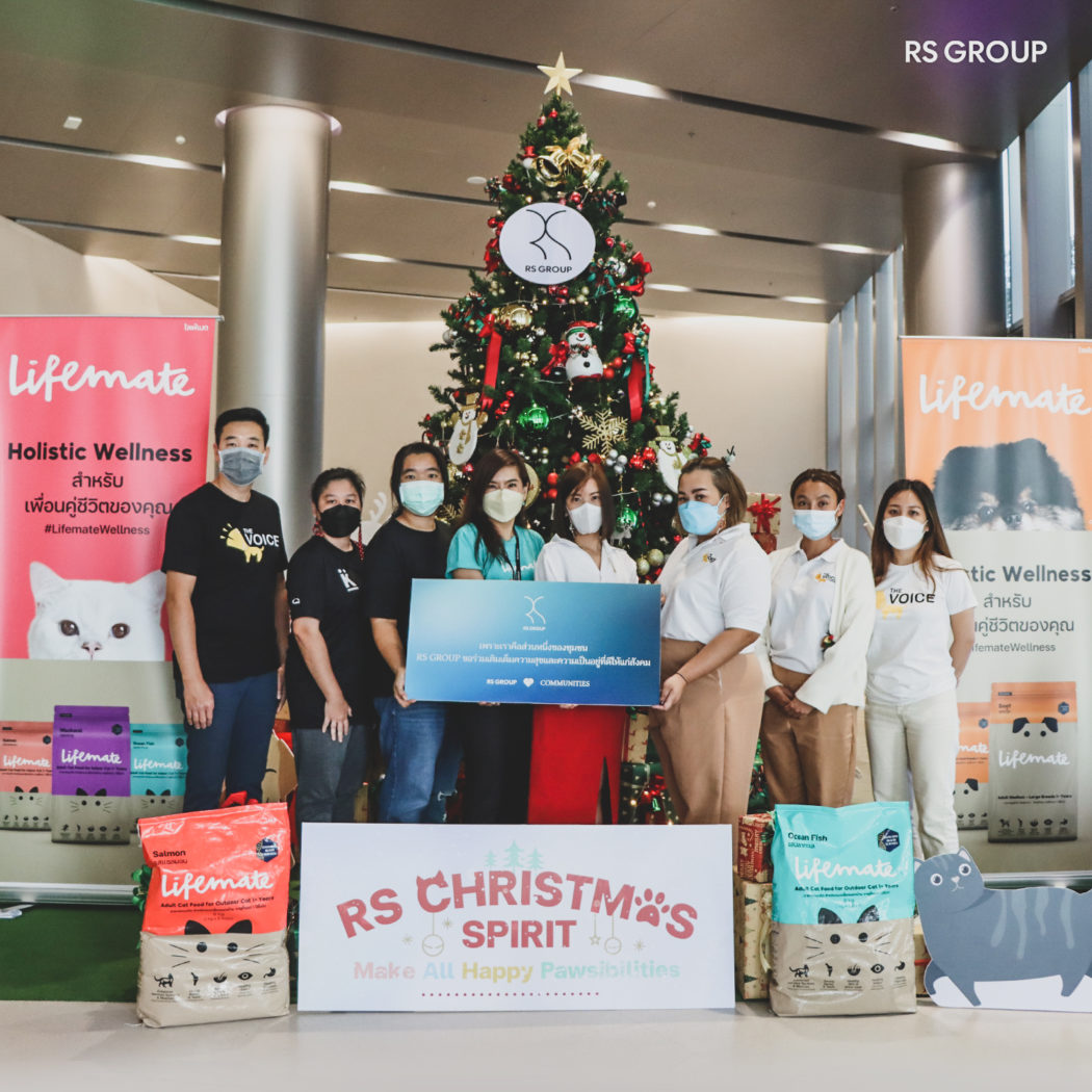 อาร์เอส กรุ๊ป ใส่ใจและให้ความสำคัญกับคุณภาพชีวิตของทุกคน รวมไปถึงเหล่าสัตว์เลี้ยง และสัตว์ที่ถูกทอดทิ้งในชุมชน คริสต์มาส ปี 2564 จึงร่วมกับ Lifemate แบรนด์อาหารสัตว์เลี้ยงในเครือ จัดงาน “RS Christmas Spirit” Make all Happy Pawsibilities เพื่อมอบผลิตภัณฑ์และระดมทุนจากกิจกรรมสอยดาวและออกร้านของพนักงานในองค์กร ให้กับมูลนิธิเดอะวอยซ์ (เสียงจากเรา) และมูลนิธิรักษ์แมว ปันน้ำใจให้แมวจร เพื่อสนับสนุนการทำงานช่วยเหลือสัตว์ที่ถูกทอดทิ้งให้มีคุณภาพชีวิตที่ดีขึ้น