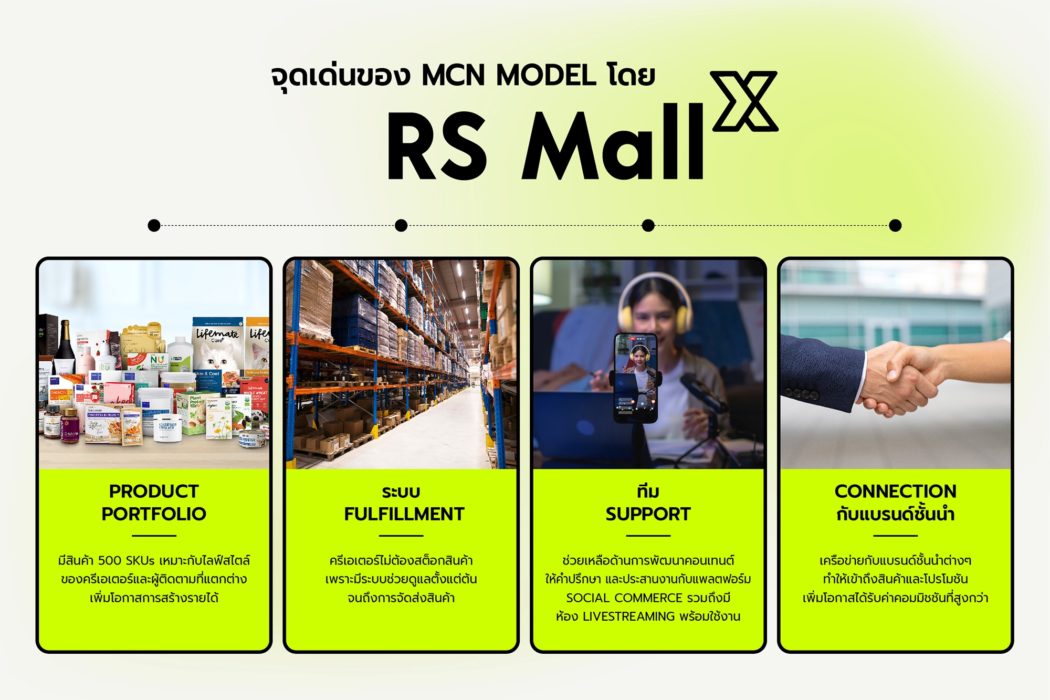 ทั้งนี้ MCN Model ของ RS Mall X ภายใต้คอนเซ็ปต์ ‘RS Mall X Extreme Convenience สะดวกสุดใจ สบายสุดขีด’ จะเพิ่มประสิทธิภาพการทำงานของเครือข่ายครีเอเตอร์ ตั้งแต่ต้นน้ำยันปลายน้ำ ผ่านจุดแข็งที่แตกต่าง ดังนี้