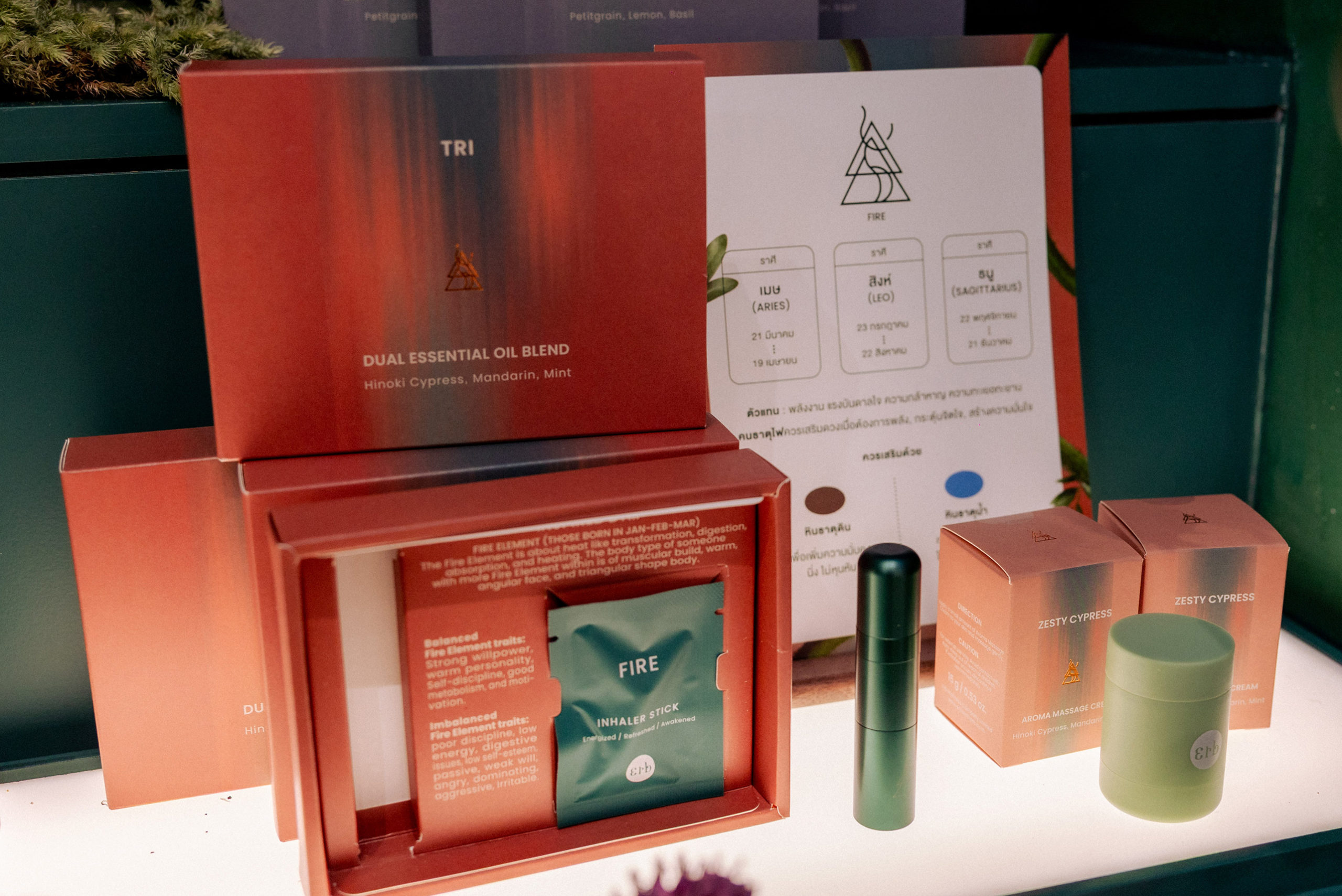 - ธาตุไฟ (Fire) – กลิ่น TRI (ไตร): สัญลักษณ์ของความมีพลัง (ราศีเมถุน สิงห์ ธนู) ด้วยส่วนผสมของฮิโนกิ ส้มแมนดาริน มินต์ ช่วยเพิ่มความตื่นตัว กระปรี้กระเปร่า